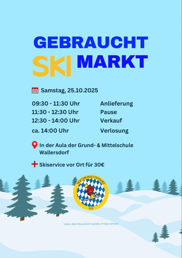 Am Samstag, 25.10 findet wieder unser Gebrauchtskimarkt in Wallersdorf statt. Wer ein Schnäppchen machen will, muss auf jeden Fall vorbeischauen. Die Anlieferung der gebrauchten Waren kann von 9.30 bis 11.30 Uhr erfolgen, der Verkauf ist von 12.30 bis 14 Uhr, circa 14 Uhr ist die Verlosung. Zum Skikurs gibt es wichtige Informationen und es wird ein Skiservice vor Ort angeboten.